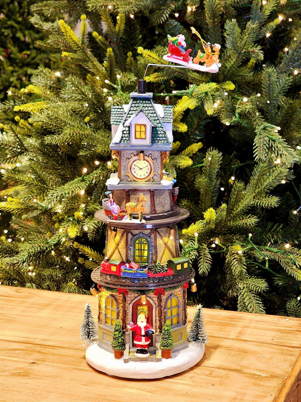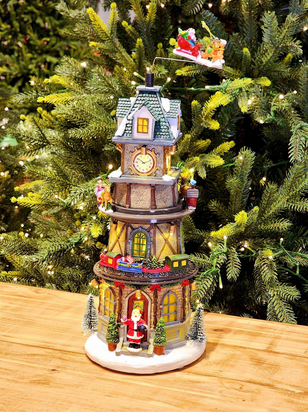 Cenário natalino torre com relógio decorativo, a peça possui movimento do trenzinho em volta da torre e movimento do treno no topo a peça possui luz e som.